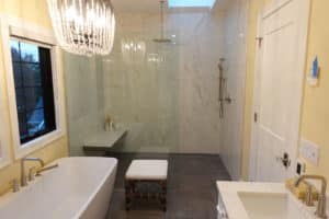 What I’m seeing is a move away from the standard tub-shower combo toward large, walk-in shower designs with built-in seating, multiple shower heads, and seamless glass enclosures.